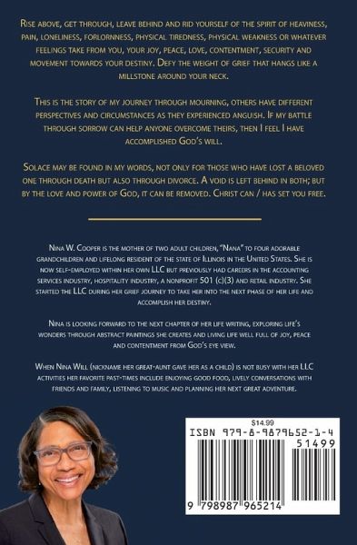 Rise above, get through, leave behind, and rid yourself of the spirit of heaviness, pain, loneliness, forlornness, physical tiredness, physical weakness, or whatever feelings take from you your joy, peace, love, contentment, security, and movement towards your destiny.Defy the weight of grief that hangs like a millstone around your neck. This is the story of my journey through mourning. Others have different perspectives and circumstances as they experienced anguish. But if my battle through sorrow can help anyone overcome theirs, then I feel I have accomplished God's will. Solace may be found in my words, not only for those who have lost a beloved through death but also through divorce. A void is left behind in both; but by the love and power of God, it can be removed. Christ can/has set you free.