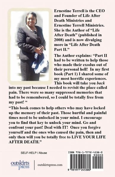 Ernestine Terrell is the CEO and Founder of Life After Death Ministries and Ernestine Terrell Ministries. She is the Author of "Life After Death" (published in 2008) and is now divulging more in "Life After Death Part II." The Author explains: "Part II had to be written to help those who made their exodus out of their personal hell! In my first book (Part 1) I shared some of my most horrific experiences. This book will take you back into my past because I needed to revisit the place called pain. There were so many suppressed memories that had to be remembered, so I could be totally free from my past!" "This book comes to help others who may have locked up the memory of their past. Those hurtful and painful times need to be unlocked in your mind. I encourage you to find that key to unlock your mind. Go and confront your past! Deal with IT!" "Once you forgive yourself and the ones who caused the pain, then and only then will you be totally free to LIVE YOUR LIFE AFTER DEATH."