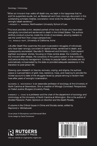 Life after Death Row examines the post-incarceration struggles of individuals who have been wrongly convicted of capital crimes, sentenced to death, and subsequently exonerated. Saundra D. Westervelt and Kimberly J. Cook present eighteen exonerees’ stories, focusing on three central areas: the invisibility of the innocent after release, the complicity of the justice system in that invisibility, and personal trauma management. Contrary to popular belief, exonerees are not automatically compensated by the state or provided adequate assistance in the transition to post-prison life. With no time and little support, many struggle to find homes, financial security, and community. They have limited or obsolete employment skills and difficulty managing such daily tasks as grocery shopping or banking. They struggle to regain independence, self-sufficiency, and identity. Drawing upon research on trauma, recovery, coping, and stigma, the authors weave a nuanced fabric of grief, loss, resilience, hope, and meaning to provide the richest account to date of the struggles faced by people striving to reclaim their lives after years of wrongful incarceration.