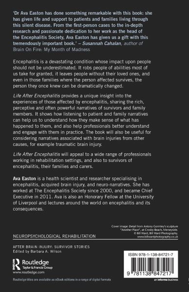 Life After Encephalitis provides a unique insight into the experiences of those affected by encephalitis, sharing the rich, perceptive, and often powerful, narratives of survivors and family members. It shows how listening to patient and family narratives can help us to understand how they make sense of what has happened to them, and also help professionals better understand and engage with them in practice. The book will also be useful for considering narratives associated with brain injuries from other causes, for example traumatic brain injury.