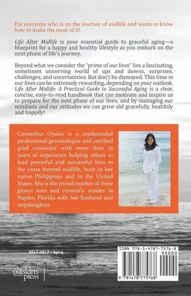 Life After Midlife: A Practical Guide to Successful Aging illuminates the blind spots many people have about navigating life past midlife. Author Carmelina Oyales, CPG, is a credentialed gerontologist with a master's degree in gerontology. Oyales pours her extensive education and professional counseling experience into practical advice for meeting the physical, emotional, and psychological changes that come with aging, including creating opportunity, stability and freedom. Aimed at everyone who wants to grow old gracefully and successfully, Life After Midlife also offers specific advice for the Filipino expatriate. Oyales guides readers to act now on elements that can impact all aspects of life in later years.