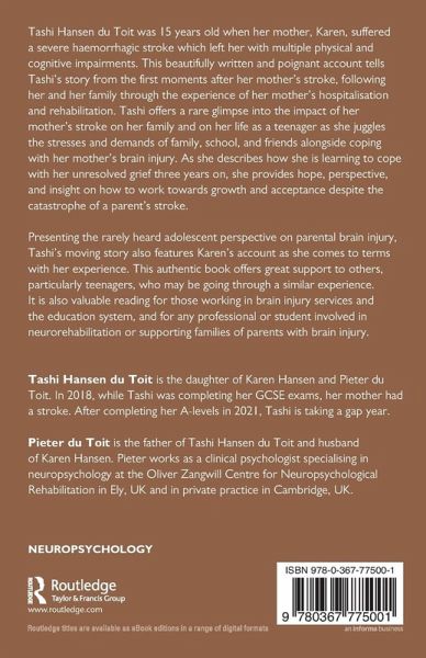 Tashi Hansen du Toit is the daughter of Karen Hansen and Pieter du Toit. In 2018, while Tashi was completing her GCSE exams, her mother had a stroke. After completing her A-levels in 2021, Tashi is taking a gap year. Pieter du Toit is the father of Tashi Hansen du Toit and husband of Karen Hansen. Pieter works as a clinical psychologist specialising in neuropsychology at the Oliver Zangwill Centre for Neuropsychological Rehabilitation in Ely, UK and in private practice in Cambridge, UK.