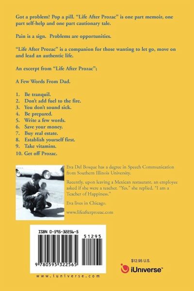 Got a problem? Pop a pill. Life After Prozac is one part memoir, one part self-help and one part cautionary tale. Pain is a sign. Problems are opportunities. Life After Prozac is a companion for those wanting to let go, move on and lead an authentic life. An excerpt from Life After Prozac; A Few Words From Dad 1. Be tranquil. 2. Don't add fuel to the fire. 3. You don't sound sick. 4. Be prepared. 5. Write a few words. 6. Save your money. 7. Buy real estate. 8. Establish yourself first. 9. Take vitamins. 10. Get off Prozac.