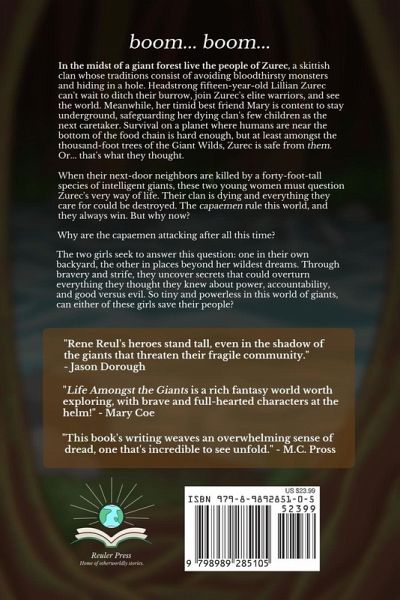 boom... boom... In the midst of a giant forest live the people of Zurec, a skittish clan whose traditions consist of avoiding bloodthirsty monsters and hiding in a hole. Headstrong fifteen-year-old Lillian Zurec can't wait to ditch their burrow, join Zurec's elite warriors, and see the world. Meanwhile, her timid best friend Mary is content to stay underground, safeguarding her dying clan's few children as the next caretaker. Survival on a planet where humans are near the bottom of the food chain is hard enough, but at least among the thousand-foot trees of the Giant Wilds, Zurec is protected from them. Or... that's what they thought. When their next-door neighbors are killed by a forty-foot-tall species of intelligent giants, these two young women must question Zurec's very way of life. Their clan is dying and everything they care for could be destroyed. The capaemen rule this world, and they always win. But why now? Why are the capaemen attacking after all this time? The two girls seek to answer that question: one in their own backyard, the other in places beyond her wildest dreams. Through bravery and strife, they uncover secrets that could overturn everything they thought they knew about power, accountability, and good versus evil. So tiny and powerless in this world of giants, can either of these girls save their people? They may be small, but even the small can make huge ripples.