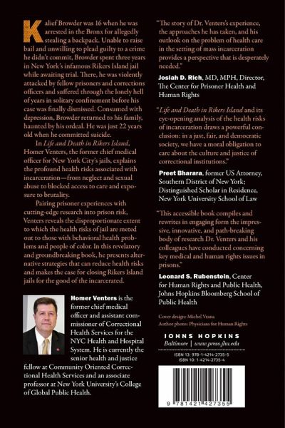 Kalief Browder was 16 when he was arrested in the Bronx for allegedly stealing a backpack. Unable to raise bail and unwilling to plead guilty to a crime he didn't commit, Browder spent three years in New York's infamous Rikers Island jail--two in solitary confinement--while awaiting trial. After his case was dismissed in 2013, Browder returned to his family, haunted by his ordeal. Suffering through the lonely hell of solitary, Browder had been violently attacked by fellow prisoners and corrections officers throughout his incarceration. Consumed with depression, Browder committed suicide in 2015. He was just 22 years old. In Life and Death in Rikers Island, Homer Venters, the former chief medical officer for New York City's jails, explains the profound health risks associated with incarceration. From neglect and sexual abuse to blocked access to care and exposure to brutality, Venters details how jails are designed and run to create new health risks for prisoners--all while forcing doctors and nurses into complicity or silence. Pairing prisoner experiences with cutting-edge research into prison risk, Venters reveals the disproportionate extent to which the health risks of jail are meted out to those with behavioral health problems and people of color. He also presents compelling data on alternative strategies that can reduce health risks. This revelatory and groundbreaking book concludes with the author's analysis of the case for closing Rikers Island jails and his advice on how to do it for the good of the incarcerated.