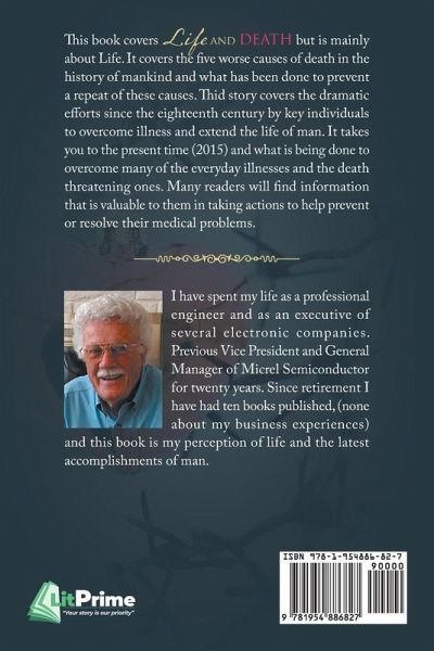 This book covers Life and Death but is mainly about Life. It covers the five worse causes of death in the history of mankind and what has been done to prevent a repeat of these causes. This story covers the dramatic efforts since the eighteenth century by key individuals to overcome illness and extend the life of man. It takes you to the present time (2015) and what is being done to overcome many of the everyday illnesses and the death threatening ones. Many readers will find information that is valuable to them in taking action to help prevent or resolve their medical problems.