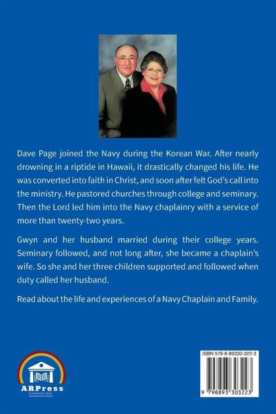 Dave Page joined the Navy during the Korean War. After nearly drowning in a riptide in Hawaii, it drastically changed his life. He was converted into faith in Christ, and soon after felt God's call into the ministry. He pastored churches through college and seminary. Then the Lord led him into the Navy chaplainry with a service of more than twenty-two years. Gwyn and her husband married during their college years. Seminary followed, and not long after, she became a chaplain's wife. So she and her three children supported and followed when duty called her husband. Read about the life and experiences of a Navy Chaplain and Family.