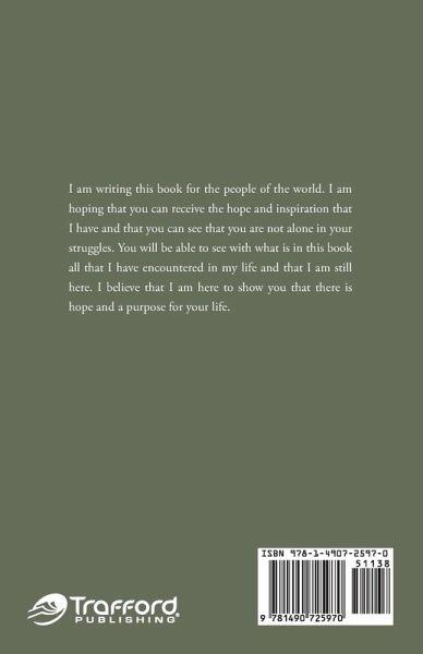 I am writing this book for the people of the world. I am hoping that you can receive the hope and inspiration that I have and that you can see that you are not alone in your struggles. You will be able to see with what is in this book all that I have encountered in my life and that I am still here. I believe that I am here to show you that there is hope and a purpose for your life.