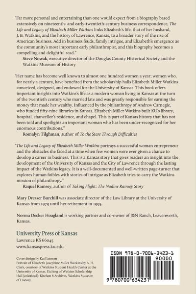 Few women have had a more significant impact on the development and growth of Lawrence, Kansas, and the University of Kansas than Elizabeth Miller Watkins. Elizabeth Josephine Miller was born in Ohio in 1861 and moved with her family to Lawrence when she was a child. She attended the University of Kansas's preparatory school in the 1870s but could not complete her education when a family financial crisis forced her to seek employment. She started working at the J. B. Watkins Land and Mortgage Company in 1887 as a secretary and in 1909 she married the company's founder and owner, Jabez Watkins. Together the Watkinses dedicated themselves to philanthropy and were committed to giving all their wealth, as Elizabeth said, "for the good of humanity, chiefly here in Lawrence." Jabez died in 1921, leaving Elizabeth to manage the family fortune alone. Elizabeth wished to give women the opportunity for higher education that she herself had never received. In 1925, the Kansas Board of Regents approved her request to have a women's scholarship hall built at KU. Watkins Hall, named in memory of her late husband, was constructed close to Elizabeth's home--now the chancellor's residence--and was followed a decade later by the construction of Miller Hall in 1936. As two of the twelve scholarship halls at the University of Kansas today, Watkins and Miller Halls are home to a vibrant cohort of young female scholars and an active alumnae community who continue the philanthropic vision of Elizabeth Miller Watkins. In 1929, Elizabeth donated $200,000 for the new Lawrence Memorial Hospital to be built at 3rd and Maine, where it remains today. She also established the first on-campus healthcare provider, Watkins Memorial Hospital, at the University of Kansas (now Twente Hall) in 1931. In this engaging biography, Mary Dresser Burchill and Norma Decker Hoagland's extensive research successfully paints a portrait of a remarkable woman whose generosity endures at KU and in Lawrence and brings to light the astonishing legacy of one of the city's leading philanthropists.