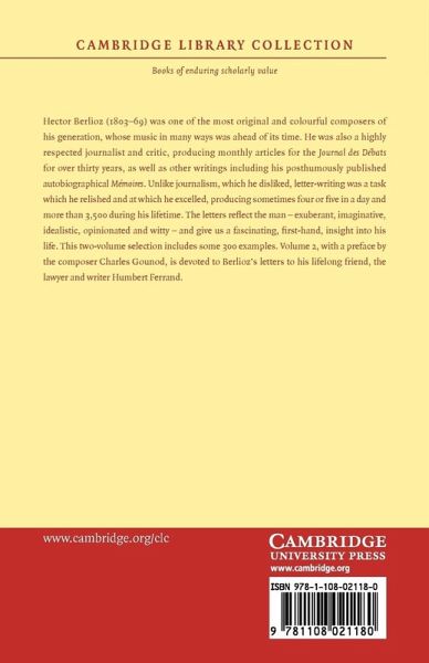 Hector Berlioz (1803-1869) was one of the most original and colourful composers of his generation, whose music in many ways was ahead of its time. He was also a highly respected journalist and critic, producing monthly articles for the Journal des Débats for over thirty years, as well as other writings including his posthumously published autobiographical Mémoires. Unlike journalism, which he disliked, letter-writing was a task which he relished and at which he excelled, producing sometimes four or five in a day and more than 3,500 during his lifetime. The letters reflect the man - exuberant, imaginative, idealistic, opinionated and witty - and give us a fascinating, first-hand, insight into his life. This two-volume selection includes some 300 examples. Volume 2, with a preface by the composer Charles Gounod, is devoted to Berlioz's letters to his lifelong friend, the lawyer and writer Humbert Ferrand.