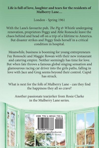 Pre-order the BRAND NEW instalment in the bestselling Mulberry Lane series! With Mulberry Lane's favourite pub, The Pig & Whistle undergoing renovation, proprietors Peggy and Able Ronoscki leave the chaos behind and head off on a trip of a lifetime to America. But disaster hits and Peggy finds herself in a critical condition in hospital. Meanwhile, business is booming for young entrepreneurs Fay Ronoscki and Maggie Rowan with their new restaurant and catering empire. It seems neither has time for love. But when fate throws a famous global singing sensation and glamourous racing car driver into the girls paths, falling in love with Jace and Greg seems beyond their control. Cupid has struck. Life is made up of laughter, love and tears. What is next for the folk of Mulberry Lane - can they find the happiness they all so crave? Another passionate tearjerker from Rosie Clarke in the Mulberry Lane series.