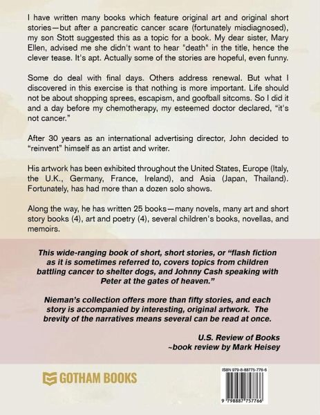 I have written many books which feature original art and original short stories-but after a pancreatic cancer scare (fortunately misdiagnosed), my son Stott suggested this as a topic for a book. My dear sister, Mary Ellen, advised me she didn't want to hear "death" in the title, hence the clever tease. It's apt. Actually some of the stories are hopeful, even funny. Some do deal with final days. Others address renewal. But what I discovered in this exercise is that nothing is more important. Life should not be about shopping sprees, escapism, and goofball sitcoms. So I did it and a day before my chemotherapy, my esteemed doctor declared, "it's not cancer." After 30 years as an international advertising director, John decided to "reinvent" himself as an artist and writer. His artwork has been exhibited throughout the United States, Europe (Italy, the U.K., Germany, France, Ireland) and Asia (Japan, Thailand). Fortunately, has had more than a dozen solo shows. Along the way, he has written 25 books- many novels, many art and short story books (4), art and poetry (4), several children's books, novellas, and memoirs.