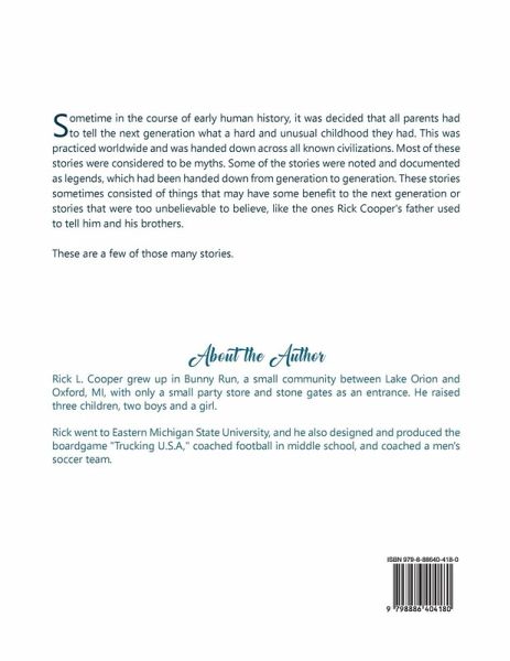 Sometime in the course of early human history, it was decided that all parents had to tell the next generation what a hard and unusual childhood they had. This was practiced worldwide and was handed down across all known civilizations. Most of these stories were considered to be myths. Some of the stories were noted and documented as legends, which had been handed down from generation to generation. These stories sometimes consisted of things that may have some benefit to the next generation or stories that were too unbelievable to believe, like the ones Rick Cooper's father used to tell him and his brothers. These are a few of those many stories.