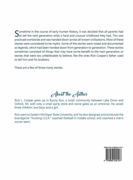 Sometime in the course of early human history, it was decided that all parents had to tell the next generation what a hard and unusual childhood they had. This was practiced worldwide and was handed down across all known civilizations. Most of these stories were considered to be myths. Some of the stories were noted and documented as legends, which had been handed down from generation to generation. These stories sometimes consisted of things that may have some benefit to the next generation or stories that were too unbelievable to believe, like the ones Rick Cooper's father used to tell him and his brothers. These are a few of those many stories.