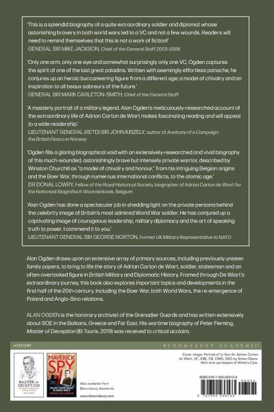 In this ground-breaking new book, Alan Ogden brings to life Lt Gen sir Adrian Carton de Wiart, soldier, statesman and an often-overlooked figure in British Military and Diplomatic History. Framed through the life of Carton de Wiart this book also offers an exploration of important topics and developments in the first half of the 20th-century, including the Boer War, World War I, World War II and Anglo-Sino relations. This biography ranges from de Wiart's early life, his wartime experiences and role as Churchill's personal representative to Chiang Kai-shek. Ogden draws from an extensive array of primary sources including previously unseen private family papers to examine, in exquisite detail, the life and times of a man who experienced the horrors of war to rise up the ranks and become a personal representative of Winston Churchill and then Clement Attlee. This book will be of interest to undergraduate and postgraduate students, as well as scholars studying British Military and Diplomatic history in the first half of the twentieth century.