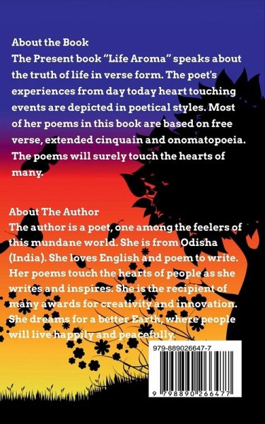 The Present book "Life Aroma" speaks about the truth of life in verse form. Poet's experiences from day today heart touching events are depicted in poetical styles. Most of her poems in this book are based on free verse, extended cinquain and onomatopoeia. The poems will surely touch the hearts of many.