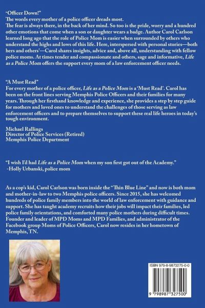 As a cop's kid, Carol Carlson was born into the "Thin Blue Line" and now is both mom and mother-in-law to two Memphis police officers. Since 2015, she has welcomed hundreds of police family members into the world of law enforcement with guidance and support. She has taught academy recruits how their jobs will impact their families, led police family orientations, and comforted many police mothers during difficult times. Founder and leader of MPD Moms and MPD Families in Memphis, and Administrator of the national Facebook group, Moms of Police Officers, Carol now resides in her hometown of Memphis, TN.