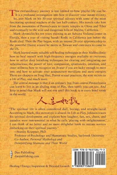 NOTE: This is the latest full-color edition, published in 2021. This extraordinary journey is not limited to how playful life can be. It is a profound investigation into how to discover your innate divinity. So, join Mark on his 50-year spiritual odyssey with some of the most fascinating spiritual teachers of the last half-century. His travels take him from the mountains of Pennsylvania to exotic temples in China and Tibet and eventually to the wild and dangerous hills of Malibu, California. Mark chronicles his ten years training in an Advaita Vedanta center in Florida, then a year of visiting Suzuki Roshi in California just before the Roshi died. Then the Play began, with an intense 28-year apprenticeship to the powerful Daoist wizard he meets in Taiwan and convinces to come to the US. Mark learned many valuable self-healing techniques in their Malibu clinic: how to heal oneself with high-frequency energies available to everyone; how to utilize deep breathing techniques for clearing and integrating our subconscious; the power of love, compassion, spontaneity, intuition, and inner stillness; how to recognize an Avatar if you are lucky enough to meet one; and how to activate your acupuncture meridians and auric energies. There are chapters on Feng Shui, Daoist sexual practices, the nine secrets to a life of Play, and much more. The central message is that if an ordinary boy from central Pennsylvania can learn to live in an abiding state of Play, then surely you can too. And keep in mind that Mark will not rest until this book is in every hotel room in the world.