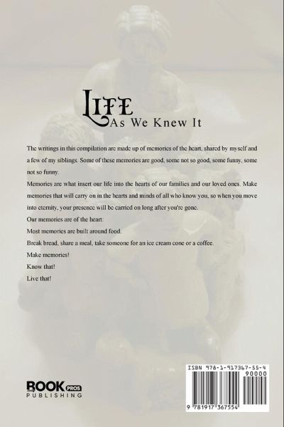 Life As We Knew The writings in this compilation are made up of memories of the heart, shared by myself and a few of my siblings. Some of these memories are good, some not so good, some funny, some not so funny. Memories are what insert our life into the hearts of our families and our loved ones. Make memories that will carry on in the hearts and minds of all who know you, so when you move into eternity, your presence will be carried on long after you're gone. Our memories are of the heart: Most memories are built around food. Break bread, share a meal and take someone for an ice cream cone or a coffee. Make memories! Know that! Live that!