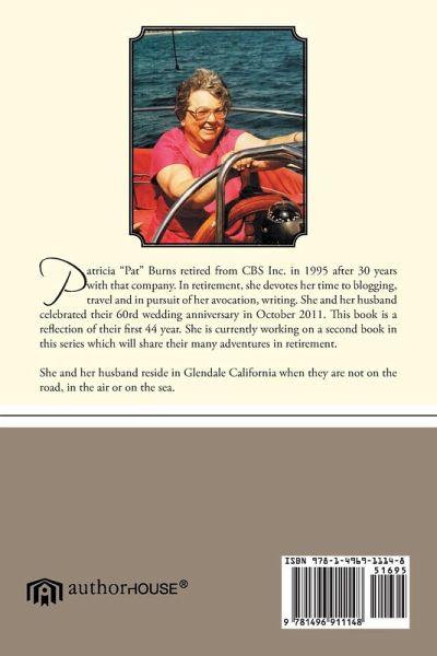 Patricia ?Pat? Burns retired from CBS Inc. in 1995 after 30 years with that company. In retirement, she devotes her time to blogging, travel and in pursuit of her avocation, writing. She and her husband celebrated their 60rd wedding anniversary in October 2011. This book is a reflection of their first 44 year. She is currently working on a second book in this series which will share their many adventures in retirement. She and her husband reside in Glendale California when they are not on the road, in the air or on the sea.