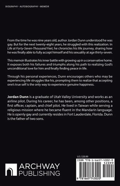 Life at 47,000 Feet is an autobiography from the life of Jordan Dunn. It chronicles his lifes journey from the time he realized he was gay at the young age of 9 until he was finally able to fully accept himself as being gay at the age of 37. This book illustrates his inner battle with growing up in a conservative Latter-Day Saint home and exposes both his failures and triumphs along his journey to realizing Gods unconditional love for him and finally finding peace in life.