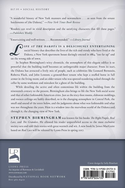 Life at the Dakota is a deliciously entertaining social history which describes the lives of the rich and trendy who have lived at the Dakota, a New York apartment house daringly erected in 1884, "too far up" and on the wrong side of town. In Stephen Birmingham’s witty chronicle, the atmosphere of this elegant edifice is so powerful that the building itself becomes an unforgettable major character. From its start the Dakota has attracted a lively mix of people, from celebrities Leonard Bernstein, Roberta Flack, and John Lennon, to a ground-floor tenant who kept a stuffed horse in full armor in the living room, and yet another older tenant who was spotted wandering naked through the cellar by some workmen, mistaken for a ghost of the building. While detailing the active and often contentious life within the building from the nineteenth century to the present, Mr. Birmingham also brings to life the New York social scene and that of other fashionable American cities. Just as the sixty-foot rooms, the elaborate moldings and rococo ceilings are lushly described, so is the changing atmosphere in Central Park, the smell and sound of the street below, the judgments about what was fashionable and what was not throughout the years. Here is a window into the marvelous world of The Dakota and through it, the changing view of New York.