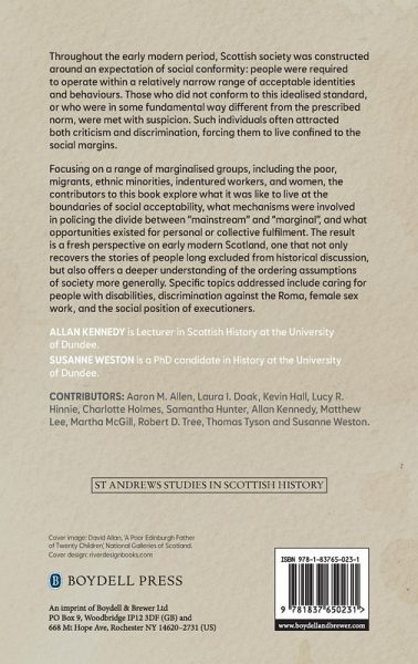 An exploration of the diverse lived experiences of marginality in Scottish society from the sixteen to the eighteenth century. Throughout the early modern period, Scottish society was constructed around an expectation of social conformity: people were required to operate within a relatively narrow range of acceptable identities and behaviours. Those who did not conform to this idealised standard, or who were in some fundamental way different from the prescribed norm, were met with suspicion. Such individuals often attracted both criticism and discrimination, forcing them to live confirmed to the social margins. Focusing on a range of marginalised groups, including the poor, migrants, ethnic minorities, indentured workers and women, the contributors to this book explore what it was like to live at the boundaries of social acceptability, what mechanisms were involved in policing the divide between "mainstream" and "marginal", and what opportunities existed for personal or collective fulfilment. The result is a fresh perspective on early modern Scotland, one that not only recovers the stories of people long excluded from historical discussion, but also offers a deeper understanding of the ordering assumptions of society more generally. Specific topics addressed range from the marginalisation of people with disabilities in the domestic sphere to female sex workers, and the place of executioners in society.