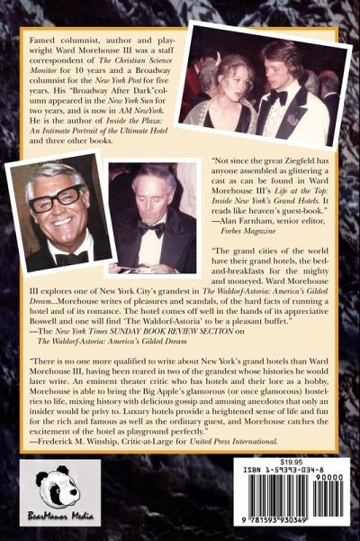 "Life at the Top: Inside New York's Grand Hotels," a celebrity biography of some of New York's grandest and most romantic hotels, contains dozens of original stories about famous literary, theater and movie personalities. Author Ward Morehouse III, a columnist for AM New York, former columnist for the New York Sun and the New York Post and a staff correspondent for 10 years for the Christian Science Monitor, briefly chronicles the lives of many of the 20th Century's literary and artistic giants who lived at the Plaza, Waldorf-Astoria, Algonquin, St. Regis, Carlyle, Chelsea and many other hotels. Morehouse paints a unique portrait of their glamorous, exciting, touching and sometimes tragic lives in the golden era of New York hotels and theater, bringing the two worlds together in a work that reads like great fiction. He reconfirms his status as a superb chronicler of Americana as well as one of our most engaging storytellers.