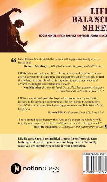 Life Balance Sheet (LBS), the name itself suggests assessing my life. Intriguing! -Dr Amit Mukherjee, MD (Orthopaedic Surgeon) and LBS Trainer. LBS holds a mirror to your life. It brings clarity and direction to make course correction. It is a simple and elegant tool which helps you to find that balance in your life which is important to gain inner peace and achieve meaningful and sustainable success. -Nemichandra, Former GM and Dean, HAL. Management Academy Former Director, BAeHAL Software Ltd. LBS is a simple and powerful logic which connects very well with leaders on the corporate environment. The best part is the compelling "profit" that it delivers after balancing your assets and liabilities -Your happiness. -Suresh BR, Ex Country Head, HR Bosch Ltd. I have started believing now that "you can't change the whole world, but, if you change little bit of yourself, you can see the changed world" -Manjula Nagendra, A Counsellor and practitioner of LBS. Life Balance Sheet is a simplified process for self-growth, team building, and enhancing harmony and happiness in the family, while you are climbing the ladder in your occupation.
