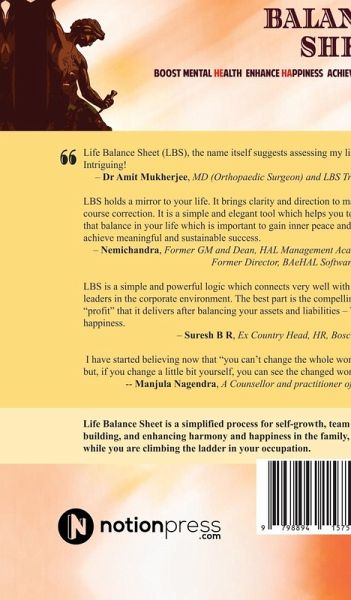 Life Balance Sheet (LBS), the name itself suggests assessing my life. Intriguing! -Dr Amit Mukherjee, MD (Orthopaedic Surgeon) and LBS Trainer. LBS holds a mirror to your life. It brings clarity and direction to make course correction. It is a simple and elegant tool which helps you to find that balance in your life which is important to gain inner peace and achieve meaningful and sustainable success. -Nemichandra, Former GM and Dean, HAL. Management Academy Former Director, BAeHAL Software Ltd. LBS is a simple and powerful logic which connects very well with leaders on the corporate environment. The best part is the compelling "profit" that it delivers after balancing your assets and liabilities -Your happiness. -Suresh BR, Ex Country Head, HR Bosch Ltd. I have started believing now that "you can't change the whole world, but, if you change little bit of yourself, you can see the changed world" -Manjula Nagendra, A Counsellor and practitioner of LBS. Life Balance Sheet is a simplified process for self-growth, team building, and enhancing harmony and happiness in the family, while you are climbing the ladder in your occupation.