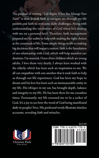 The purpose of writing, "Life Begins When You Manage Your Faith" is that, it took faith to navigate me through my life passion and faith to overcome daily challenges. Along with understanding the revelations of God when he's dealing with me on a personal level. Therefore, faith management prepared me for reality to help with making the right choices at the crossroads of life. From simple things in life to making big decisions that will impact a nation, faith is the foundation of our relationship with God, which will help manifest our destinies. I'm married, I have three children which are young adults. I love them very dearly. I always have worked with the elderly, which has been such an inspiration to me. We all can empathize with one another that it took faith to help us through our life experiences. God has been my hope to dream and his love has been such an immeasurable entity in my life. His whisper in my ear, has brought depth, balance and integrity to my life. He has been there for me countless times. Fortunately, my life rerouted me to be a seeker of God. It's a joy to see how the word of God being manifested daily in peoples' lives. His profound words illustrate timeless accounts, revealing faith and miracles.