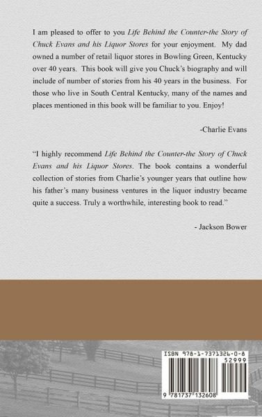 "I am pleased to offer to you Life Behind the Counter-the Story of Chuck Evans and his Liquor Stores for your enjoyment. My dad owned a number of retail liquor stores in Bowling Green, Kentucky over 40 years. This book will give you Chuck's biography and will include a number of stores from his 40 years in the business. For those who live in South Central Kentucky, many of the names and places mentioned in this book will be familiar to you. Enjoy!" - Charlie Evans