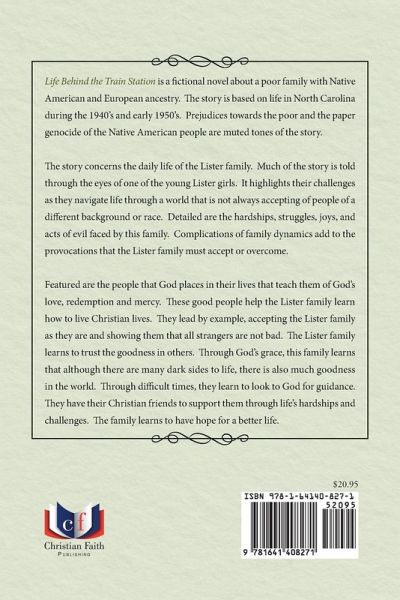 Life Behind the Train Station is a fictional novel about a poor family with Native American and European ancestry. The story is based on life in North Carolina during the 1940's and early 1950's. Prejudices towards the poor and the paper genocide of the Native American people are muted tones of the story. The story concerns the daily life of the Lister family. Much of the story is told through the eyes of one of the young Lister girls. It highlights their challenges as they navigate life through a world that is not always accepting of people of a different background or race. Detailed are the hardships, struggles, joys, and acts of evil faced by this family. Complications of family dynamics add to the provocations that the Lister family must accept or overcome. Featured are the people that God places in their lives that teach them of God's love, redemption and mercy. These good people help the Lister family learn how to live Christian lives. They lead by example, accepting the Lister family as they are and showing them that all strangers are not bad. The Lister family learns to trust the goodness in others. Through God's grace, this family learns that although there are many dark sides to life, there is also much goodness in the world. Through difficult times, they learn to look to God for guidance. They have their Christian friends to support them through life's hardships and challenges. The family learns to have hope for a better life.