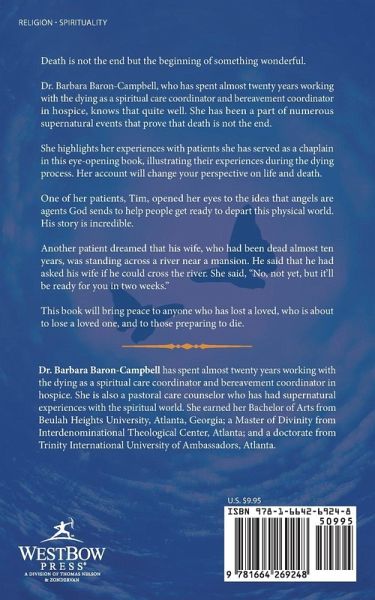 Death is not the end but the beginning of something wonderful. Dr. Barbara Baron-Campbell, who has spent almost twenty years working with the dying as a spiritual care coordinator and bereavement coordinator in hospice, knows that quite well. She has been a part of numerous supernatural events that prove that death is not the end. She highlights her experiences with patients she has served as a chaplain in this eye-opening book, illustrating their experiences during the dying process. Her account will change your perspective on life and death. One of her patients, Tim, opened her eyes to the idea that angels are agents God sends to help people get ready to depart this physical world. His story is incredible. Another patient dreamed that his wife, who had been dead almost ten years, was standing across a river near a mansion. He said that he had asked his wife if he could cross the river. She said, "No, not yet, but it'll be ready for you in two weeks." This book will bring peace to anyone who has lost a loved, who is about to lose a loved one, and to those preparing to die.