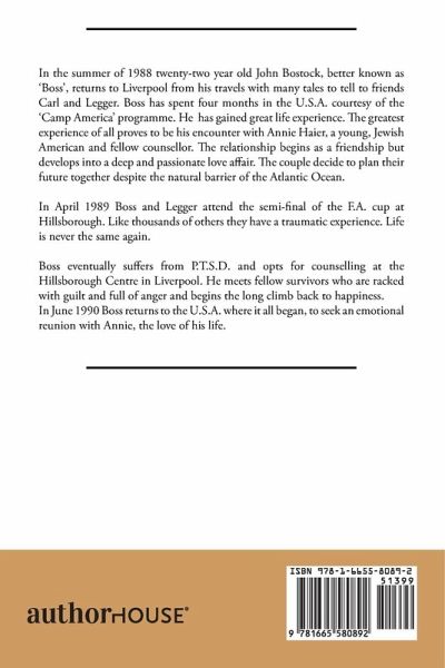 In the summer of 1988 twenty-two year old John Bostock, better known as 'Boss', returns to Liverpool from his travels with many tales to tell to friends Carl and Legger. Boss has spent four months in the U.S.A. courtesy of the 'Camp America' programme. He has gained great life experience. The greatest experience of all proves to be his encounter with Annie Haier, a young, Jewish American and fellow counsellor. The relationship begins as a friendship but develops into a deep and passionate love affair. The couple decide to plan their future together despite the natural barrier of the Atlantic Ocean. In April 1989 Boss and Legger attend the semi-final of the F.A. cup at Hillsborough. Like thousands of others they have a traumatic experience. Life is never the same again. Boss eventually suffers from P.T.S.D. and opts for counselling at the Hillsborough Centre in Liverpool. He meets fellow survivors who are racked with guilt and full of anger and begins the long climb back to happiness. In June 1990 Boss returns to the U.S.A. where it all began, to seek an emotional reunion with Annie, the love of his life.