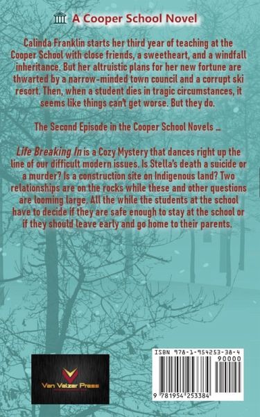 Calinda Franklin starts her third year of teaching at the Cooper School with close friends, a sweetheart, and a windfall inheritance. Suddenly, her altruistic plans for her new fortune are thwarted by a narrow-minded town council and a corrupt ski resort. Then, when a student dies in tragic circumstances, it seems like things can't get worse. But they do. The Second Episode in the Cooper School Novels . . . Life Breaking In is a Cozy Mystery that dances right up the line of our difficult modern issues. Is Stella's death a suicide or a murder? Is a construction site on Indigenous land? Two relationships are on the rocks while these and other questions are looming large. All the while the students at the school have to decide if they are safe enough to stay at the school or if they should leave early and go home to their parents.