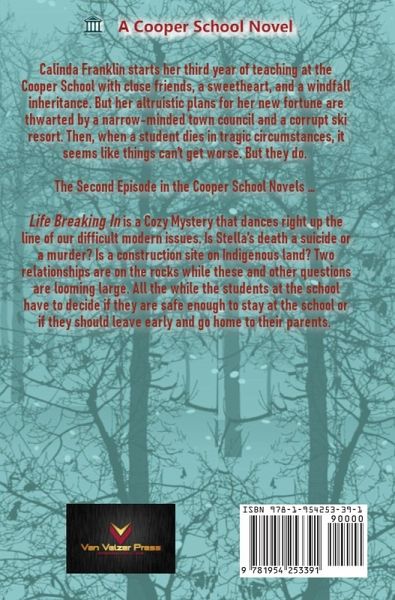 Calinda Franklin starts her third year of teaching at the Cooper School with close friends, a sweetheart, and a windfall inheritance. Suddenly, her altruistic plans for her new fortune are thwarted by a narrow-minded town council and a corrupt ski resort. Then, when a student dies in tragic circumstances, it seems like things can't get worse. But they do. The Second Episode in the Cooper School Novels . . . Life Breaking In is a Cozy Mystery that dances right up the line of our difficult modern issues. Is Stella's death a suicide or a murder? Is a construction site on Indigenous land? Two relationships are on the rocks while these and other questions are looming large. All the while the students at the school have to decide if they are safe enough to stay at the school or if they should leave early and go home to their parents.