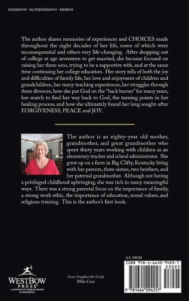 The author shares memories of experiences and CHOICES made throughout the eight decades of her life, some of which were inconsequential and others very life-changing. After dropping out of college at age seventeen to get married, she became focused on raising her three sons, trying to be a supportive wife, and at the same time continuing her college education. Her story tells of both the joy and difficulties of family life, her love and enjoyment of children and grandchildren, her many teaching experiences, her struggles through three divorces, how she put God on the "back burner" for many years, her search to find her way back to God, the turning points in her healing process, and how she ultimately found her long sought-after FORGIVENESS, PEACE and JOY.