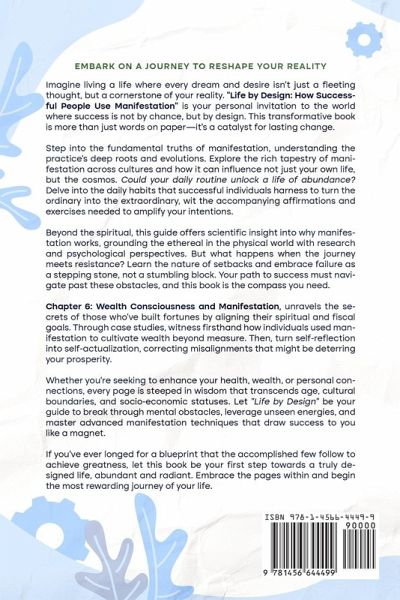 Embark on a Journey to Reshape Your Reality Imagine living a life where every dream and desire isn't just a fleeting thought, but a cornerstone of your reality. "Life by Design: How Successful People Use Manifestation" is your personal invitation to the world where success is not by chance, but by design. This transformative book is more than just words on paper-it's a catalyst for lasting change. Step into the fundamental truths of manifestation, understanding the practice's deep roots and evolutions. Explore the rich tapestry of manifestation across cultures and how it can influence not just your own life, but the cosmos. Could your daily routine unlock a life of abundance? Delve into the daily habits that successful individuals harness to turn the ordinary into the extraordinary, wit the accompanying affirmations and exercises needed to amplify your intentions. Beyond the spiritual, this guide offers scientific insight into why manifestation works, grounding the ethereal in the physical world with research and psychological perspectives. But what happens when the journey meets resistance? Learn the nature of setbacks and embrace failure as a stepping stone, not a stumbling block. Your path to success must navigate past these obstacles, and this book is the compass you need. Chapter 6: Wealth Consciousness and Manifestation, unravels the secrets of those who've built fortunes by aligning their spiritual and fiscal goals. Through case studies, witness firsthand how individuals used manifestation to cultivate wealth beyond measure. Then, turn self-reflection into self-actualization, correcting misalignments that might be deterring your prosperity. Whether you're seeking to enhance your health, wealth, or personal connections, every page is steeped in wisdom that transcends age, cultural boundaries, and socio-economic statuses. Let "Life by Design" be your guide to break through mental obstacles, leverage unseen energies, and master advanced manifestation techniques that draw success to you like a magnet. If you've ever longed for a blueprint that the accomplished few follow to achieve greatness, let this book be your first step towards a truly designed life, abundant and radiant. Embrace the pages within and begin the most rewarding journey of your life.