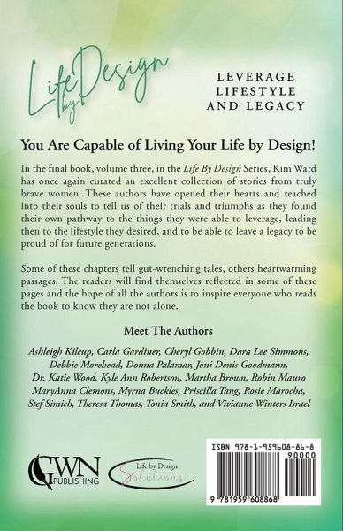 Meet the Authors: Ashleigh Kilcup, Carla Gardiner, Cheryl Gobbin, Dara Lee Simmons, Debbie Morehead, Donna Palamar, Joni Denis Goodmann, Dr. Katie Wood, Kyle Ann Robertson, Martha Brown, MaryAnna Clemons, Myrna Buckles, Priscilla Tang, Robin Mauro, Rosie Marocha, Stef Simich, Theresa Thomas, Tonia Smith, and Vivianne Winters Israel. In the final book, volume three, in the Life By Design Series, Kim Ward has once again curated an excellent collection of stories from truly brave women. These authors have opened their hearts and reached into their souls to tell us of their trials and triumphs as they found their own pathway to the things they were able to leverage, leading then to the lifestyle they desired, and to be able to leave a legacy to be proud of for future generations. Some of these chapters tell gut-wrenching tales, others heartwarming passages. The readers will find themselves reflected in some of these pages and the hope of all the authors is to inspire everyone who reads the book to know they are not alone