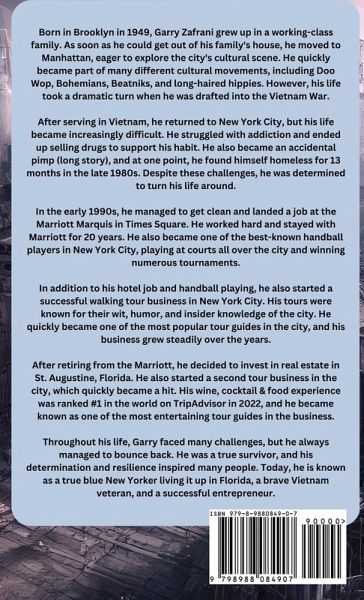 Born in Brooklyn in 1949, Garry Zafrani grew up in a working-class family. As soon as he could get out of his family's house, he moved to Manhattan, eager to explore the city's cultural scene. He quickly became part of many different cultural movements, including Doo Wop, Bohemians, Beatniks, and long-haired hippies. However, his life took a dramatic turn when he was drafted into the Vietnam War. After serving in Vietnam, he returned to New York City, but his life became increasingly difficult. He struggled with addiction and ended up selling drugs to support his habit. He also became an accidental pimp (long story), and at one point, he found himself homeless for 13 months in the late 1980s. Despite these challenges, he was determined to turn his life around. In the early 1990s, he managed to get clean and landed a job at the Marriott Marquis in Times Square. He worked hard and stayed with Marriott for 20 years. He also became one of the best-known handball players in New York City, playing at courts all over the city and winning numerous tournaments. In addition to his hotel job and handball playing, he also started a successful walking tour business in New York City. His tours were known for their wit, humor, and insider knowledge of the city. He quickly became one of the most popular tour guides in the city, and his business grew steadily over the years. After retiring from the Marriott, he decided to invest in real estate in St. Augustine, Florida. He also started a second tour business in the city, which quickly became a hit. His wine, cocktail & food experience was ranked #1 in the world on TripAdvisor in 2022, and he became known as one of the most entertaining tour guides in the business. Throughout his life, Garry faced many challenges, but he always managed to bounce back. He was a true survivor, and his determination and resilience inspired many people. Today, he is known as a true blue New Yorker living it up in Florida, a brave Vietnam veteran, and a successful entrepreneur.