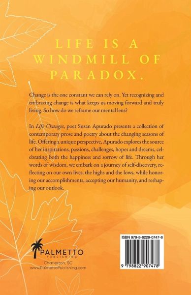 Life is a windmill of paradox. Change is the one constant we can rely on. Yet recognizing and embracing change is what keeps us moving forward and truly living. So how do we reframe our mental lens? In Life Changes, poet Susan Apurado presents a collection of contemporary prose and poetry about the changing seasons of life. Offering a unique perspective, Apurado explores the source of her inspirations, passions, challenges, hopes and dreams, celebrating both the happiness and sorrow of life. Through her words of wisdom, we embark on a journey of self-discovery, reflecting on our own lives, the highs and the lows, while honoring our accomplishments, accepting our humanity, and reshaping our outlook.