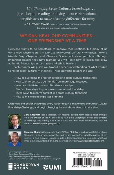 We can heal our communities--one friendship at a time. Everyone wants to do something to improve race relations, but many of us don't know where to start. In Life-Changing Cross-Cultural Friendships, lifelong friends Gary Chapman and Clarence Shuler will show you how. Through important lessons they have learned, you will learn how to begin and grow authentic friendships across racial and ethnic barriers. Each chapter will guide you toward deeper understanding of what it takes to foster cross-cultural friendships. These powerful lessons include: * How to overcome the fear of developing cross-cultural friendships * How to differentiate true friends from mere acquaintances * How Jesus initiated cross-cultural relationships * The first two steps to your own cross-cultural friendship * Three ways to resolve conflict in a cross-cultural friendship * How to make friendships last a lifetime Chapman and Shuler challenge every reader to join a movement, the Cross-Cultural Friendship Challenge, and begin changing the world one friendship at a time.