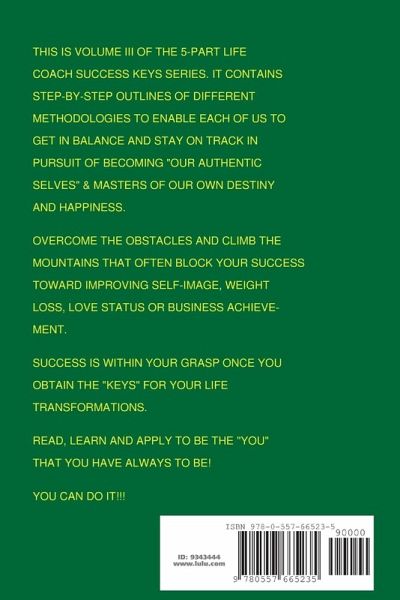 This volume is Volume III of the 5-part LIFE COACH SUCCESS KEYS series. LIFE COACH 301: THE SUCCESS KEYS TO WEIGHT LOSS, LOVE and BUSINESS contains step by step outlines of different methodologies to enable each of us to get in balance and stay on track in pursuit of becoming "our authentic selves" and masters of our own destiny and happiness. There are different procedures described to enable us to overcome life's difficulties and to climb the mountains that often block our desired success toward improving our self-image (including weight loss), love status or business success. Read, learn and apply! Success is within your grasp once you obtain the "keys" for your life transformations. You can do it! You can be the "you" that you have always wanted to be!!!