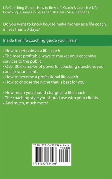 Do you want to know how to make money as a life coach, in less than 30 days? Inside this life coaching guide you'll learn:How to get paid as a life coach The most profitable ways to market your coaching services to the public Over 30 examples of powerful coaching questions you can ask your clients How to become a professional life coach How to choose the niche that is best for you How much you should charge as a life coach The coaching style you should use with your clients And much, much more! If you're ready to start getting paid for your coaching skills, then this guide is for you. The author, Sara Stephens has been a professional life coach for 12 years. She trained at the Coaches Training Institute in San Rafael, California. She is passionate about transforming lives, and teaching more people how to transform their passion for coaching into a new career. What Readers are Saying: "I have always been interested in life coaching but I never knew where to start. This book has taught me everything I needed to know on how to be a great life coach. Even if you don't want to be a life coach there is still a lot of valuable information in this great book!"