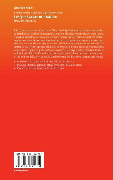 Chapter 1. Life Cycle Analysis (LCA): A retrospective overview.- Chapter 2. Life Cycle Assessment - A Brief Definition and Overview.- Chapter 3. Application of LCA to Aviation.- Chapter 4. Application of LCA to Aviation Fuels.- Chapter 5. Life Cycle Assessment (LCA) Applications in Airports.- Chapter 6. Exergoenvironmental analysis of Medium-Size Turboprop Engine (m-TPE) based Life Cycle Analysis (LCA) and Exergy.