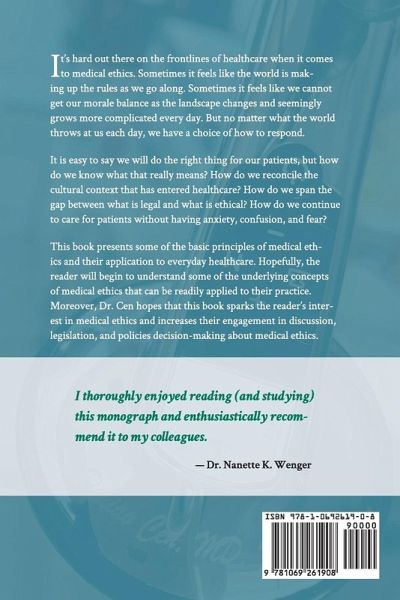It's hard out there on the frontlines of healthcare when it comes to medical ethics. Sometimes it feels like the world is making up the rules as we go along. Sometimes it feels like we cannot get our morale balance as the landscape changes and seemingly grows more complicated every day. But no matter what the world throws at us each day, we have a choice of how to respond. It is easy to say we will do the right thing for our patients, but how do we know what that really means? How do we reconcile the cultural context that has entered healthcare? How do we span the gap between what is legal and what is ethical? How do we continue to care for patients without having anxiety, confusion, and fear? This book presents some of the basic principles of medical ethics and their application to everyday healthcare. Hopefully, the reader will begin to understand some of the underlying concepts of medical ethics that can be readily applied to their practice. Moreover, Dr. Cen hopes that this book sparks the reader's interest in medical ethics and increases their engagement in discussion, legislation, and policies decision-making about medical ethics.