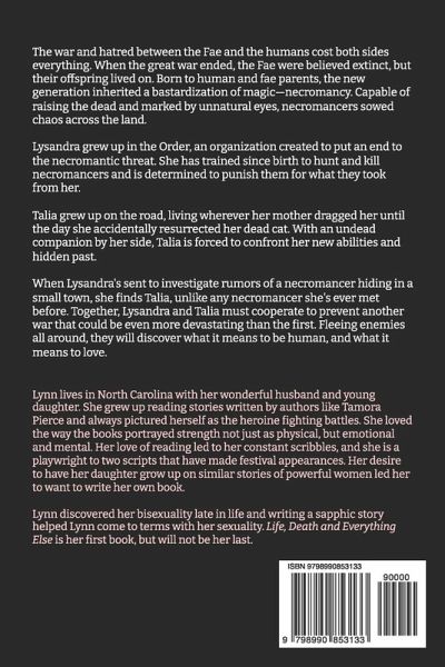 The war and hatred between the Fae and the humans cost both sides everything. When the great war ended, the Fae were believed extinct, but their offspring lived on. Born to human and fae parents, the new generation inherited a bastardization of magic-necromancy. Capable of raising the dead and marked by unnatural eyes, necromancers sowed chaos across the land. Lysandra grew up in the Order, an organization created to put an end to the necromantic threat. She has trained since birth to hunt and kill necromancers and is determined to punish them for what they took from her. Talia grew up on the road, living wherever her mother dragged her until the day she accidentally resurrected her dead cat. With an undead companion by her side, Talia is forced to confront her new abilities and hidden past. When Lysandra's sent to investigate rumors of a necromancer hiding in a small town, she finds Talia, unlike any necromancer she's ever met before. Together, Lysandra and Talia must cooperate to prevent another war that could be even more devastating than the first. Fleeing enemies all around, they will discover what it means to be human, and what it means to love.