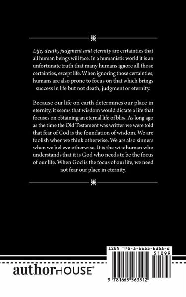 Life, death, judgment and eternity are certainties that all human beings will face. In a humanistic world it is an unfortunate truth that many humans ignore all those certainties, except life. When ignoring those certainties, humans are also prone to focus on that which brings success in life but not death, judgment or eternity. Because our life on earth determines our place in eternity, it seems that wisdom would dictate a life that focuses on obtaining an eternal life of bliss. As long ago as the time the Old Testament was written we were told that fear of God is the foundation of wisdom. We are foolish when we think otherwise. We are also sinners when we believe otherwise. It is the wise human who understands that it is God who needs to be the focus of our life. When God is the focus of our life, we need not fear our place in eternity.