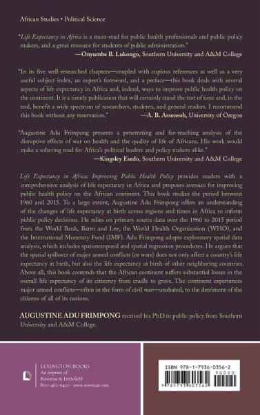 Life Expectancy in Africa: Improving Public Health Policy provides readers with a comprehensive analysis of life expectancy in Africa and proposes avenues for improving public health policy on the African continent. The book studies the period between 1960 and 2015. To a large extent, the author offers an understanding of the changes of life expectancy at birth across regions and time in Africa to inform public policy decisions. The author relied on primary source data over the 1960-2015 period from The World Bank, Barro and Lee, the World Health Organization (WHO), and the International Monetary Fund (IMF). Adu Frimpong adopted exploratory spatial data analysis, which included spatio-temporal and spatial regression procedures. Adu Frimpong argues that the spatial spillover of major armed conflicts (or wars) does not only affect a country’s life expectancy at birth, but it also affects the life expectancy at birth of other neighboring countries. Above all, this book contends that the African continent suffers substantial losses in overall life expectancy of its citizenry from cradle to the grave. The continent experiences major armed conflicts — often in the form of civil wars — unabated to the detriment of the citizens of all its nations.